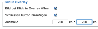 Für jedes eingefügte Bild kann im Reiter Animation ein Overlay definiert werden. Beim Überfahren des Bildes mit dem Cursor auf der Webseite erscheint eine Lupe, die zeigt, dass das Overlay aktiviert ist. Dabei können die Masse für das Overlay frei gewählt werden. Am unteren Rand des Overlays erscheint die Beschreibung des Bildes. Beim Aktivieren des Overlay muss beachtet werden, dass das Bild in genügender Auflösung hinterlegt ist, sonst wird das Bild nicht vergrössert (s. Bild 2)