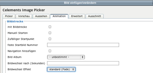 Beim Reiter Animation kann eine Slideshow (Bildstrecke) animiert werden oder für ein Bild ein Overlay definiert werden.