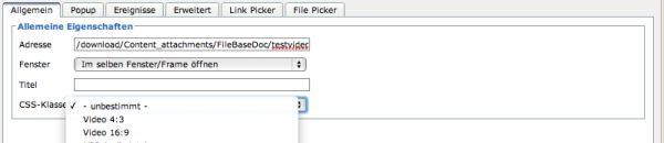 // Im Feld "Klasse" auswählen, um welchen Videotyp es sich handelt. (Externes Video z.B. von Youtube, Vimeo oder SF, oder ein eigenes, hochgeladenes Video mit Format 4:3 oder 16:9)